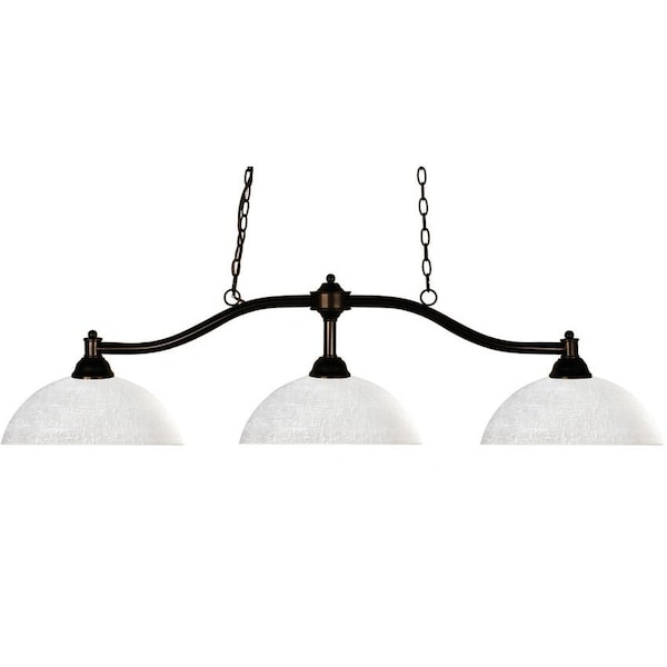Simple yet versatile detailing defines this beautiful three light fixture. Finished in bronze and paired with dome white linen glass shades, this three light fixture would be equally at home in the game room, or anywhere else in the house needing a touch of timeless charm.72 inches of chain per side is included to ensure the perfect hanging height.