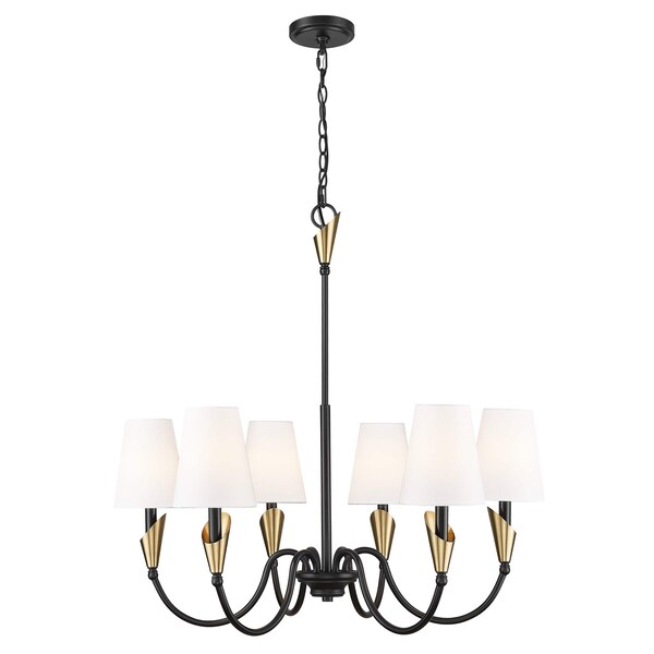 This chandelier draws the eye with its sweeping lines and luminous finishes, offering a modern update to timeless form. The matte black structure is lifted by gold accents, while six white shades diffuse the light in soft, even layers. Its statement lighting that still feels delicate.