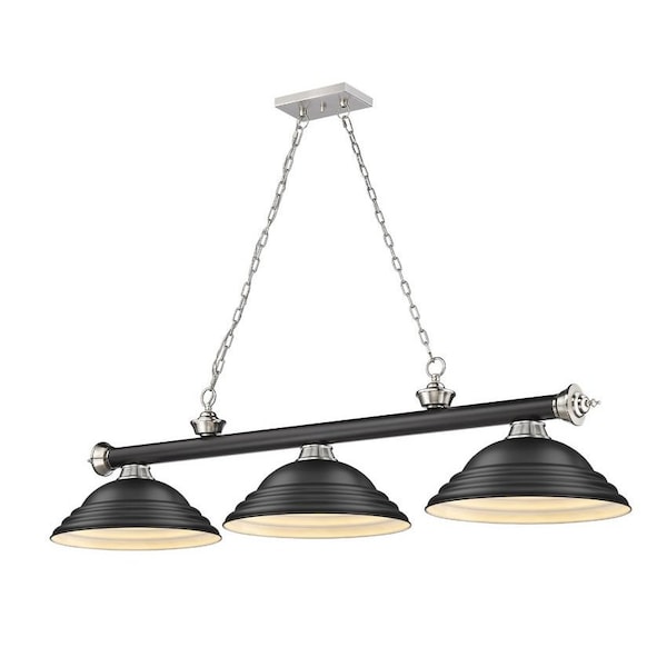 With a dramatic blend of matte black and brushed nickel finishes, this traditional, three-light metal billiard light adds sophisticated style to classic interior décor. Whether it's placed over a pool table, dining table, or kitchen island, this fashionable fixture illuminates a room in style.