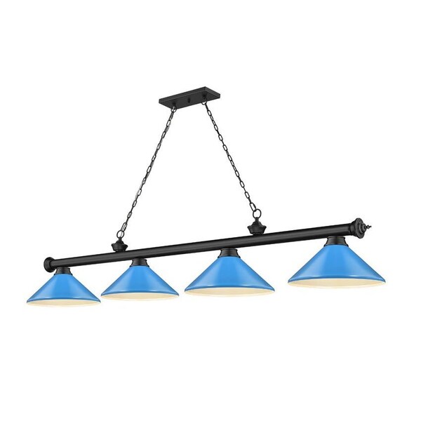 Add a pleasing pop of color to a kitchen, dining room, or game room with this traditional metal billiard light. With a vibrant aesthetic that elevates any home, this fixture features a matte black finish frame affixed with four electric blue shades to add a modern edge to classic decor.
