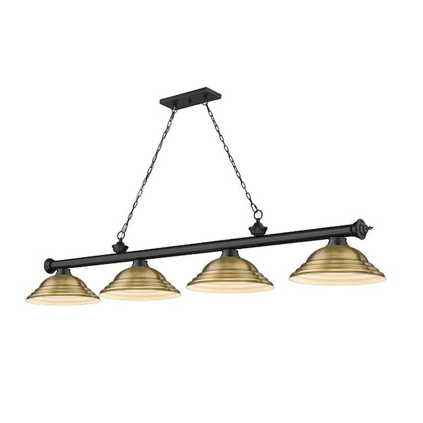 This traditional, four-light metal billiard light is treated to a matte black finish and features rubbed brass shades that add a dash of elegance to classic decor. Elevate the look of a kitchen, dining room, or game room with this attractive fixture from the Cordon collection.