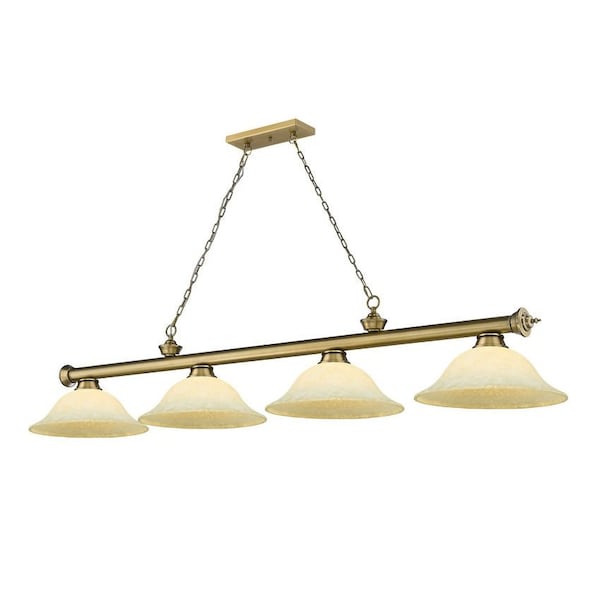 Illuminate a kitchen, dining room, or game room with this traditional metal billiard light from the Cordon collection. Featuring four delicate, golden mottle glass shades affixed to a rich, rubbed brass finish frame, this beautiful fixture adds an elegant update to classic interior décor.