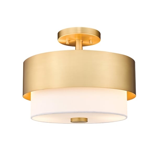Mid-Century Modern inspired design elements create a semi-flush mount ceiling light draws focus upwards and delivers a sharp, clean look in a contemporary or transitional space. This two-light fixture from the Counterpoint collection reflects a cheerful round silhouette with a cool modern gold metal frame and a soft white fabric shade. Call on a relaxed look to meet trending design aesthetics infusing ambient lighting in a kitchen, living area, or foyer.