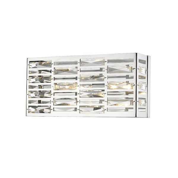 Sleek and elongated, this two-light bath sconce dresses up vanities with bright, modern style. Featuring a rectangular silhouette, the chrome frame is complete with geometric cut out shapes.