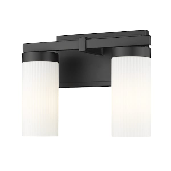 Bring a sense of streamlined elegance to your bath with a modern two-light vanity fixture. Offering beautiful, bright illumination with cylindrical white glass shades, it's anchored with a matte black finish frame with a robust design and clean straight lines for a fresh, inviting perspective.