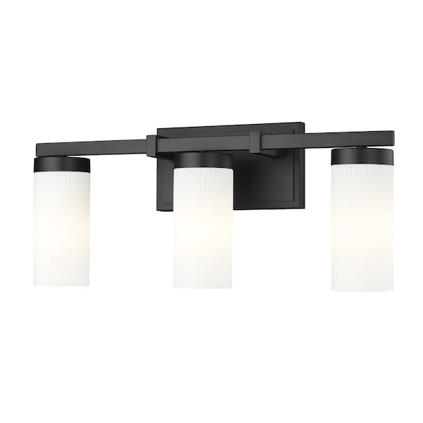Span your sink with the fresh, refined look of a modern three-light vanity fixture. In matte black, it showcases contrasting white glass shades with a cylindrical profile, delivering bright, diffused illumination perfect for morning and evening beauty and grooming. Its straight-lined silhouette is a versatile choice, spanning styles to create a fixture that works in myriad settings.