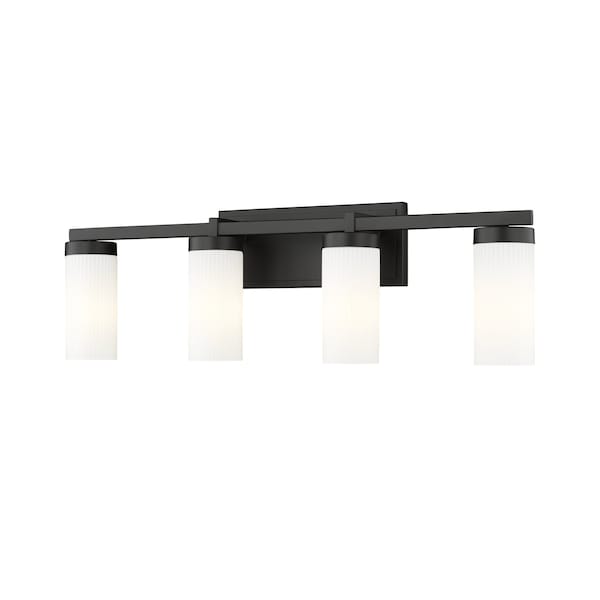 Four lights mean a generous size for a modern vanity fixture that sets the tone over a sink or makeup table. Its fresh design features clean, robust lines paired with a rich matte black finish. Cylindrical shades feature white glass, creating soft, diffused illumination for all your beauty and grooming needs.