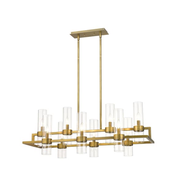 Upscale sophisticated style remains temperate and elegantly simple in the design form of this ten-light island and billiard light from the Datus collection. Show off a kitchen island or entertaining space with this linear-inspired pendant featuring solid iron with a warm rubbed brass finish and delicate clear glass cylinders in two tiers. A light sense of drama adds romance and personality to this decadent light fixture.