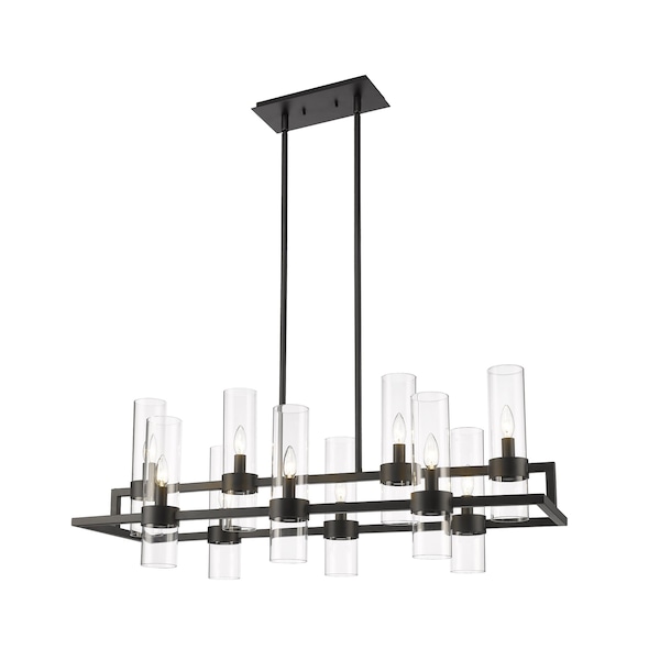 Upscale sophisticated style remains temperate and elegantly simple in the design form of this ten-light island and billiard light from the Datus collection. Show off a kitchen island or entertaining space with this linear-inspired pendant featuring solid iron with a bold matte black finish and delicate clear glass cylinders in two tiers. A light sense of drama adds romance and personality to this decadent light fixture.