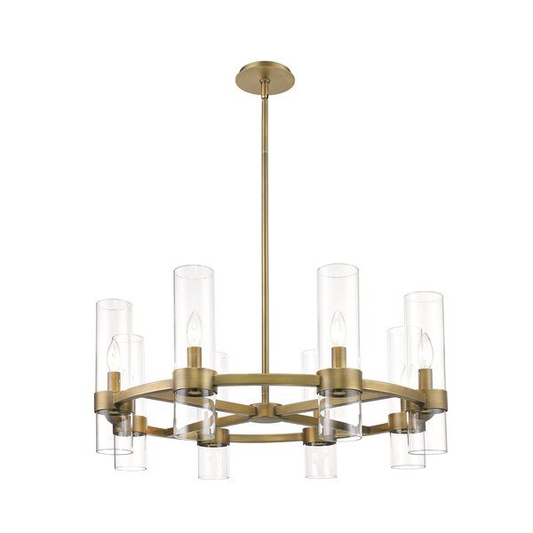 Distinctive modern style takes a page from industrial-inspired flavor, creating a captivating fixture blending polished rubbed brass finish steel and glass. With a circular spoke-style frame, the Datus eight-light chandelier lends a minimalist approach to lighting with enough glam to stand out. Perfect for a small- to mid-sized contemporary dining room, kitchen, or hallway, this chandelier delivers elegance with a round frame crafted of warm rubbed brass finish iron, dressed up with delicate clear glass cylinder shades.