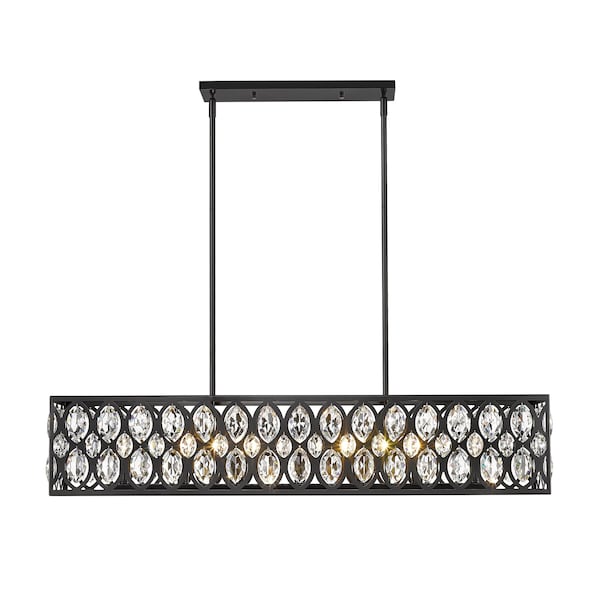 From the Dealey collection comes this contemporary seven-light chandelier, featuring a box-like rectangular design and held by two rod supports. Its elegant steel shade is punched with an ellipse-style motif, each set with a glimmering clear crystal pendant that adds stark contrast against the dark matte black finish. With an elongated shape, this chandelier spreads a warm, even glow across a wide dining table or along a hallway, adding a touch of glamour as well.