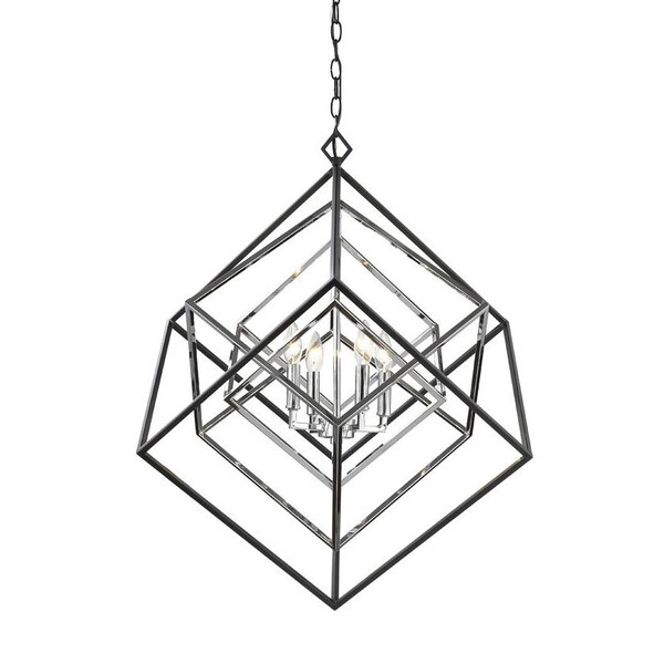 At the center of this modern, freshly designed four-light chandelier is a charming candelabra-style bulb mount that presents a fun juxtaposition. Bringing ambiance and energy to a contemporary space, this four-light chrome and matte black finish chandelier becomes a focal point in any room.
