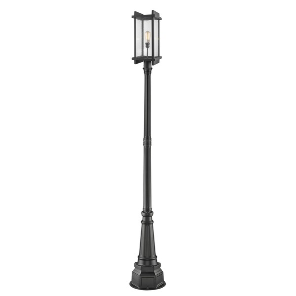 An extra dose of design detailing adds up to a fresh look in this black aluminum one-light outdoor post mounted fixture. Ideal for a custom designed exterior space, its modern frame is softened with seedy glass panels and a charming vintage-era bulb.