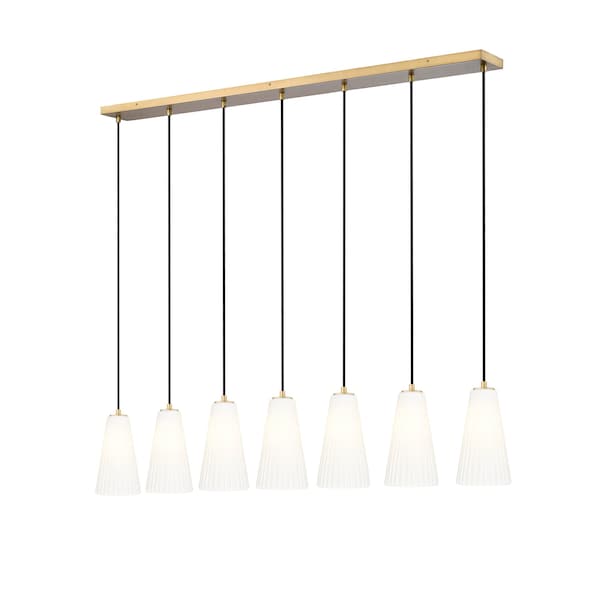 The elongated fluted shape of the Farrell series provides plenty of light in a slim silhouette. Available as a pendant as well as a wall sconce, Farrell can be ordered in a choice of Brushed Nickel, Matte Black, and Modern Gold finishes. Infuse refined energy over a kitchen island or dining table with a modern seven-light linear chandelier. A striking presentation of elongated frosted glass shades with delicate fluting highlights the fixture. Its modern gold finish canopy and hardware add a hint of warm sophistication.
