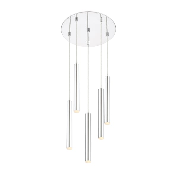 Sleek lines from this five-light pendant light marry a rounded base. Chrome radiates throughout any space, adding depth to a modern motif.