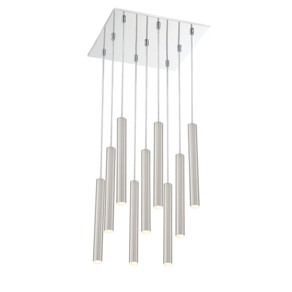 The radiant metallic finish and clean lines from this nine-light pendant light feature a brushed nickel finish. Windchime-inspired, the stylish and elongated shapes on the silhouette create a stunning centerpiece.