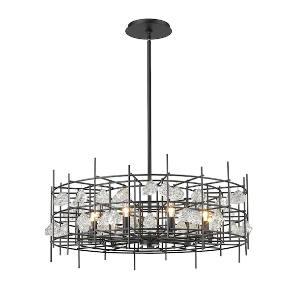 Light up a dining room, living room, or foyer with the cool, contemporary allure of this matte black chandelier. An eye-catching array of linear metal accents surround nine shining bulbs for a sophisticated design that radiates modern elegance.