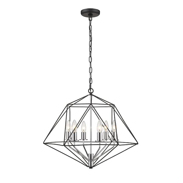 Fully energizing in its sleek geometric silhouette, this six-light chandelier delivers sophistication and contemporary verve in a modern living or dining space. Follow the angles of an open cage-like frame fashioned from two-tone finish metal in Matte Black and Chrome, and a dynamic architectural theme that offers mesmerizing effects.