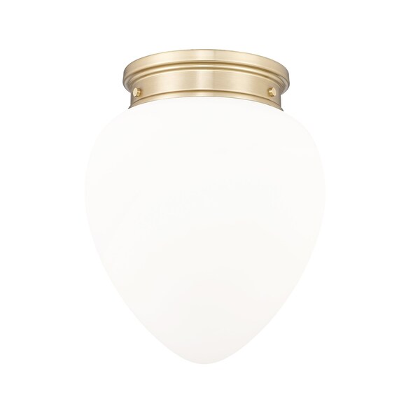 Artisanal craftsmanship harnesses the vintage charm of schoolhouse glass to create a chic silhouette for a modern one-light flush mount ceiling light. A delicately rounded, teardrop-style glass shade is crafted in etched opal glass, delivering timeless elegance that brims with versatility, complementing in casual and more formal living spaces. A modern gold finish is warm and elegant, complementing surrounding decor with ease.