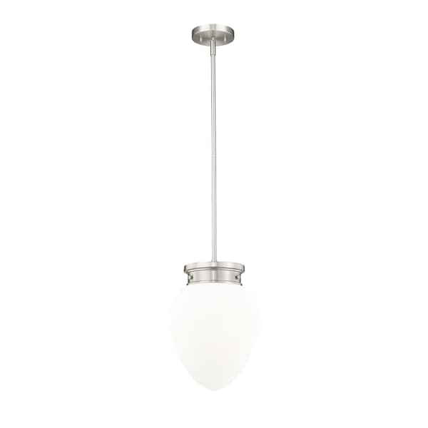 A chic silhouette is crafted with schoolhouse inspirations to bring vintage charm to a modern one-light pendant. Its timeless brushed nickel finish complements in your kitchen or dining room, with the versatility to blend beautifully in a bedroom or den. Its teardrop-style shade is crafted from matte, etched opal glass to deliver soft, diffused illumination in any setting.
