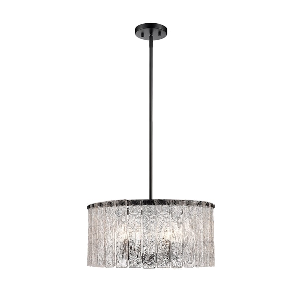 Bold matte black metal and icy textured glass blend to create the perfect mix of industrial grit and art in a fixture that dazzles in any modern or transitional space. The Glacier round five-light pendant delivers a gallery aesthetic with individual clear textured glass panels that emulate melting ice, a chic design with dramatic impact. Matte black finish steel is placed as a crown frame, providing tantalizing contrast and enhancing the gallery feel of a foyer or main living area.