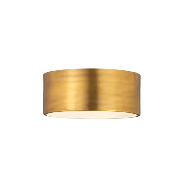 Elegant simplicity offers a minimalist design that captures attention, making this contemporary flushmount metal drum two-light ceiling light a versatile selection. This light from the Harley collection is perfect for casual, easy living spaces, offering a sleek large-form silhouette with a shade made of warm rubbed brass finish steel. Bring industrial-inspired vibes to a kitchen, dining space, or hallway with this tasteful fixture.