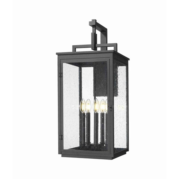 Evenings feel richer under the glow of five candle-style lights framed in a deep sand black finish. The clear seedy glass softens each flicker into something magical and inviting. This piece adds stately presence to wide facades or expansive porch walls.