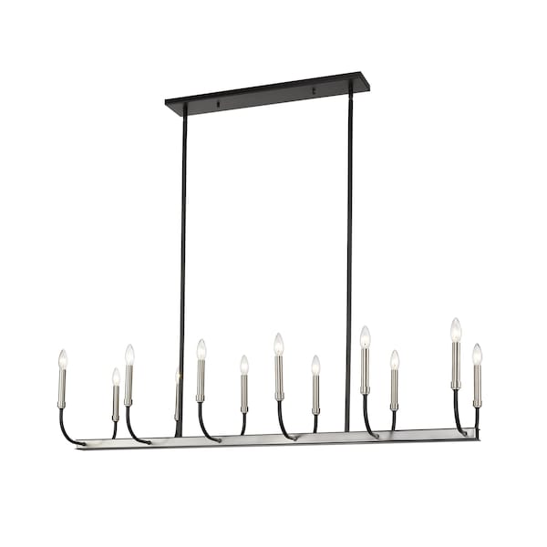 This bright two-tone twelve-light island/billiard light adds a dynamic elegance to your favorite space. It's crafted in a classic matte black and brushed nickel finish with the lights in a candle-like design. It's ideally suited for the dining room, foyer, kitchen, or entertainment room.