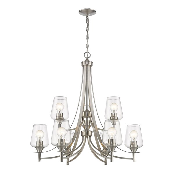 Designed with sleek metal lines and an elegant silhouette, this brushed nickel chandelier is a stunning home decor upgrade. This nine-light fixture features clear glass shades for a magnificent display of light.
