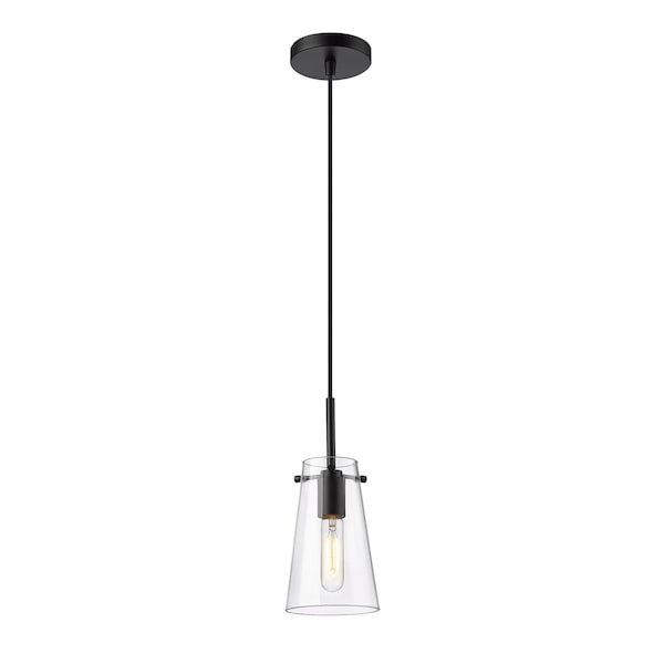 Clear glass defines a slim silhouette, bringing refined style to a modern one-light pendant. Its stately matte black finish sets the tone for a refined living space, kitchen or powder room. The gentle tapering cone silhouette of the pendant ensures its timeless look, perfect alone or in series lighting a larger space.
