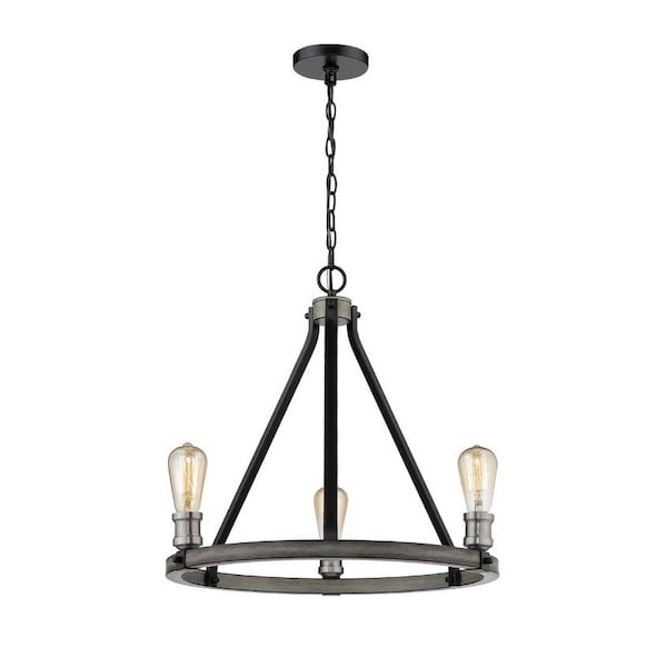 Open and airy, this three-light faux barnwood chandelier is the epitome of modern design. Intermingle the romance of exposed lightbulbs and the distressed industrial feel of the ashen finish.