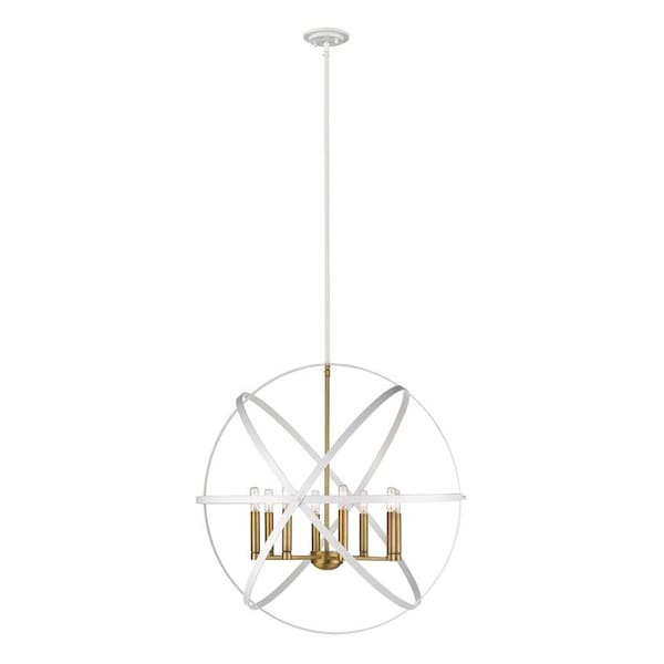 This stunning eight-light pendant light becomes an integral element in fashionable transitional decor. Illuminate a living space with the charming look of hammered white finish flat iron ribbons forming an open orb that houses eight candelabra-style bulbs in a sleek Oldee brass steel base.