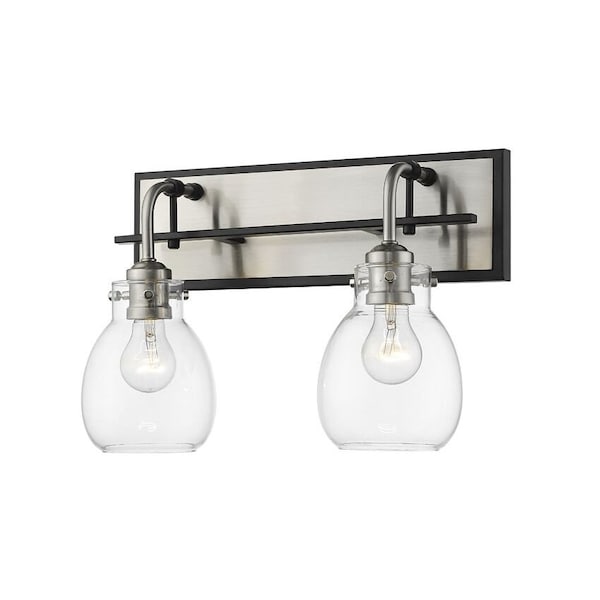 Charmingly bright, this two-light wall sconce features a clear glass shade. Full of curves and sleek lines, matte black and brushed nickel combine to create a stunning visual.