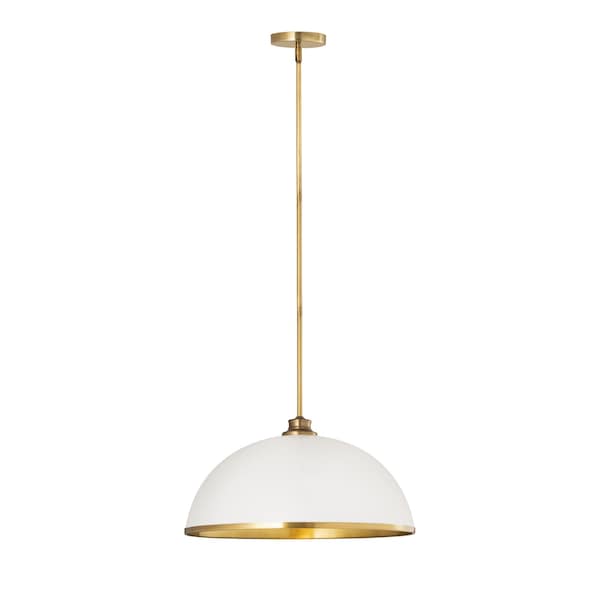 Sleek style takes on a modern look in this domed one-light pendant, a perfectly versatile way to illuminate a contemporary dining room, kitchen, or main living area. This pendant reflects myriad motifs including farmhouse, urban, and industrial, and brings simplicity with tasteful aesthetics. Crafted of matte white finish stainless steel, its accenting rubbed brass finish edge trim, down rod, and canopy deliver a decadent look.