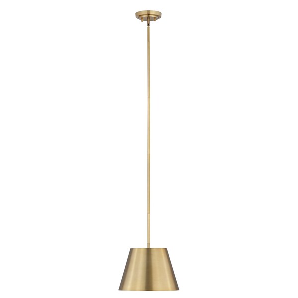 Chic in its simplicity, this modern pendant is a striking choice over a kitchen island, dining table, or living area. Refreshing in its rubbed brass with a white interior shade finish, the pendant features a compact profile with a round canopy and a modern empire shade that tapers gently to create versatile illumination.