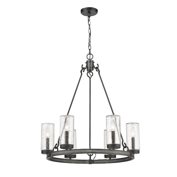 European influence guides the romantic design of the Marlow six-light outdoor pendant, creating an eye-pleasing circular silhouette perfect for a gazebo or covered patio space. Indulge in a theatrical motif with a light fixture featuring an ashen barnboard finish steel frame nestling clear seedy glass cylinder shades. Ornate, intricate detailing speaks to an effort to raise the attitude of any space.