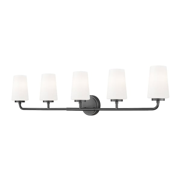 Cool matte black finishing over a steel frame creates bold definition for this modern five-light vanity wall light. Its' clean, simple silhouette evokes industrial or restoration design ideals, while easily complementing a variety of decor styles. Tall, tapering shades are crafted in ribbed opal glass for excellent texture and light diffusion.