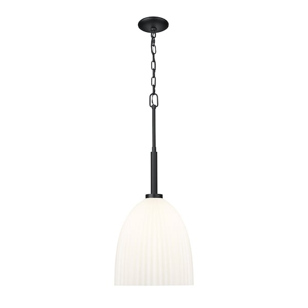 Minimal but impactful, this one-light pendant brings modern edge with its matte black finish and soft matte opal glow. The ribbed glass shade adds quiet texture, making it a standout on its own or grouped in multiples. Its a small-scale accent that speaks volumes in style.
