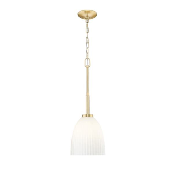 Glowing from within a modern gold finish, this one-light pendant strikes a perfect balance between softness and shine. The matte opal glass is ribbed for texture, giving the light a luxurious, almost linen-like glow. Its a radiant accent with quiet confidence.