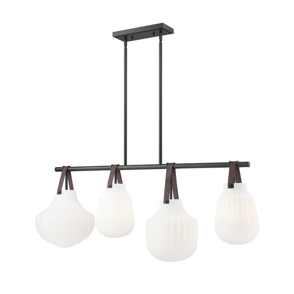 The Newbury linear fixture reinterprets the Modern Farmhouse aesthetic by adding leather strap fittings and an undulating design for the white ribbed glass shades in three shapes. The modern glass shapes and design - along with the finely detailed linear fixture - will fit into many design environments. It can be ordered in either a Matte Black or a Modern Gold finish.Bold curves and charming leather straps create a fresh modern farmhouse aesthetic for a charming four-light linear pendant. Striking over a kitchen island or table, it pairs a matte black finish with the clean-lined structure, creating a striking framework for exceptional glasswork. Four ribbed white glass shades, each in a different, undulating shape are suspended with a thick leather strap, adding organic character and impressive texture to your space.