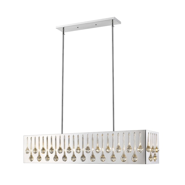 Marvel in the artistry of this exquisitely designed chrome and crystal island/billiards light. Remarkable detailing blends slender droplets of crystal over a sleek horizontal chrome finish steel frame that houses seven radiant lights.