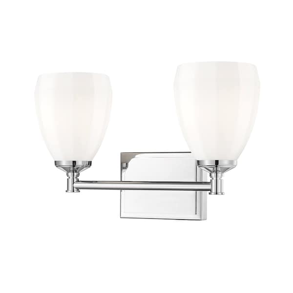 Gleaming chrome adds reflectivity and contemporary pop to the graceful silhouette of a modern two-light vanity sconce. Its simple frame and straight arm are crafted in steel for durability, while matte opal glass shades diffuse illumination and cast a warm, inviting glow. The decorative shade design is a fresh, refined touch perfect for an upgrade in your bath.