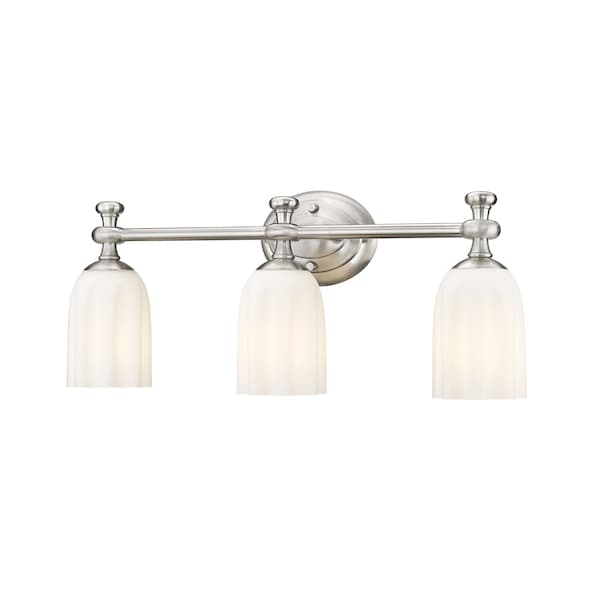 The Orion vanity series is enhanced by a flourish at the top of each frosted glass shade that brings a delicate design sensibility. Orion can be ordered in a choice of Brushed Nickel, Matte Black, Chrome, and Modern Gold finishes.A trio of scalloped opal glass shades creates a fresh, refined flair for a modern three-light vanity fixture. Perfect over a mirror, it features a chic brushed nickel finish and plenty of decorative allure with a stepped oval wall plate and decorative finials over each shade. Opal glass diffuses light beautifully for all your grooming rituals.