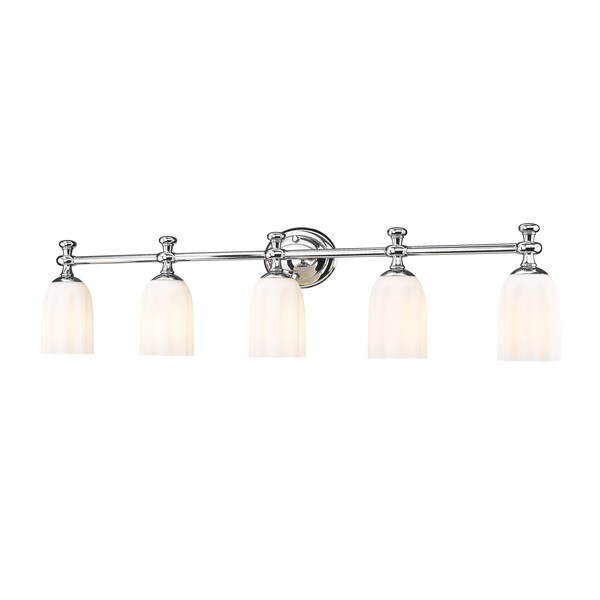 The Orion vanity series is enhanced by a flourish at the top of each frosted glass shade that brings a delicate design sensibility. Orion can be ordered in a choice of Brushed Nickel, Matte Black, Chrome, and Modern Gold finishes.A chic chrome finish adds gleaming allure to a modern five-light vanity fixture. Its chic design is anchored with an oval wall plate and paired with a straight arm and decorative flourishes. Scalloped shades feature opal etched glass, delivering a touch of romantic texture and depth over your vanity.