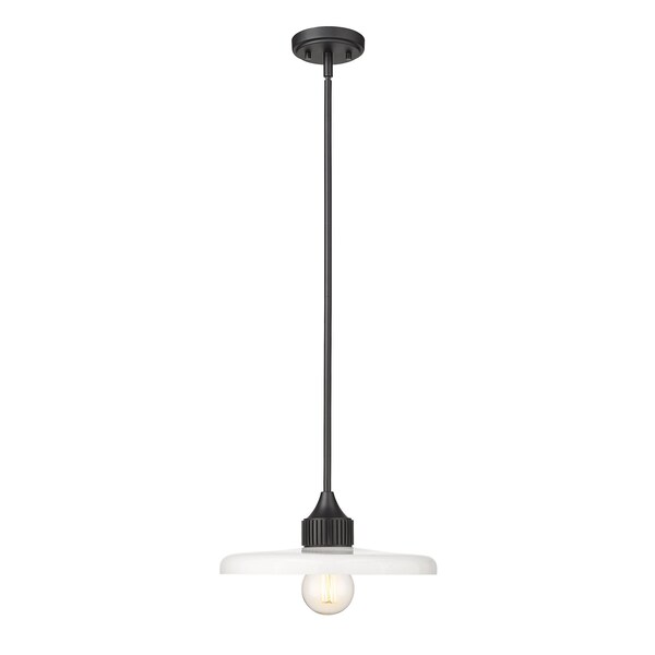 A disc of smooth, glossy opal glass diffuses the illumination from this modern one-light pendant. Dramatic in any room, the fixture pairs a crisp matte black finish with a simple, clean silhouette that promises bright illumination in a stylish but understated profile.
