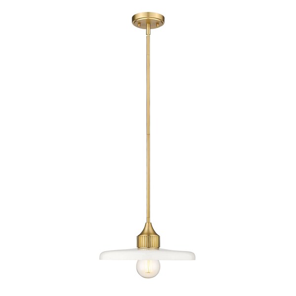 A disc of smooth, glossy opal glass diffuses the illumination from this modern one-light pendant. Dramatic in any room, the fixture pairs a warm olde brass finish with a simple, clean silhouette that promises bright illumination in a stylish but understated profile.