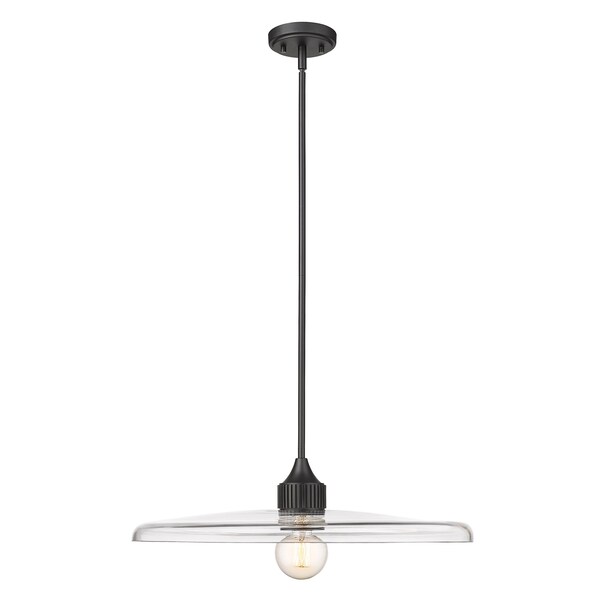 Smooth, clear glass creates a wide disc to deliver the true illumination of this modern one-light pendant. Delivering a compelling mix of whimsy and retro ambiance in any room, the fixture pairs a chic matte black finish with a simple, clean silhouette that promises bright illumination in a stylish but understated profile.