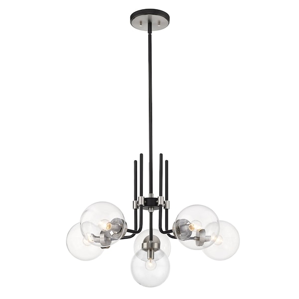 This clean, crisp six-light chandelier adds a magnificent aura to your home. It's fashioned with a matte black and brushed nickel finish and clear glass shades for the brilliant radiance you're looking for. This beauty will uplift any space in the home, whether it's the dining room, foyer, hallway, or kitchen.