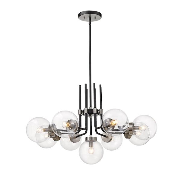 Clean, crisp lines and a majestic design highlight this nine-light chandelier for your home. It's fashioned with a matte black and brushed nickel finish and clear glass shades for the brilliant radiance you're looking for. This elegant light is perfect for the dining room, foyer, hallway, or kitchen.