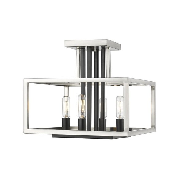 Create a stylish aesthetic in a modern space with this sleek brushed nickel finish four-light ceiling light. Its semi-flushmount build works well in lower ceilings, offering an enticing view of an open geometric steel frame hosting black finish vertical rods and candelabra-style bulb bases.